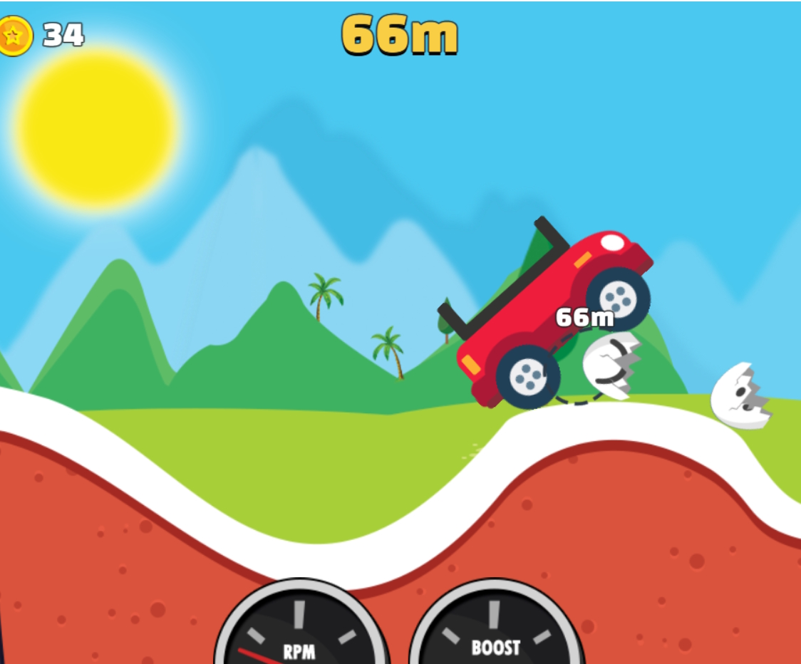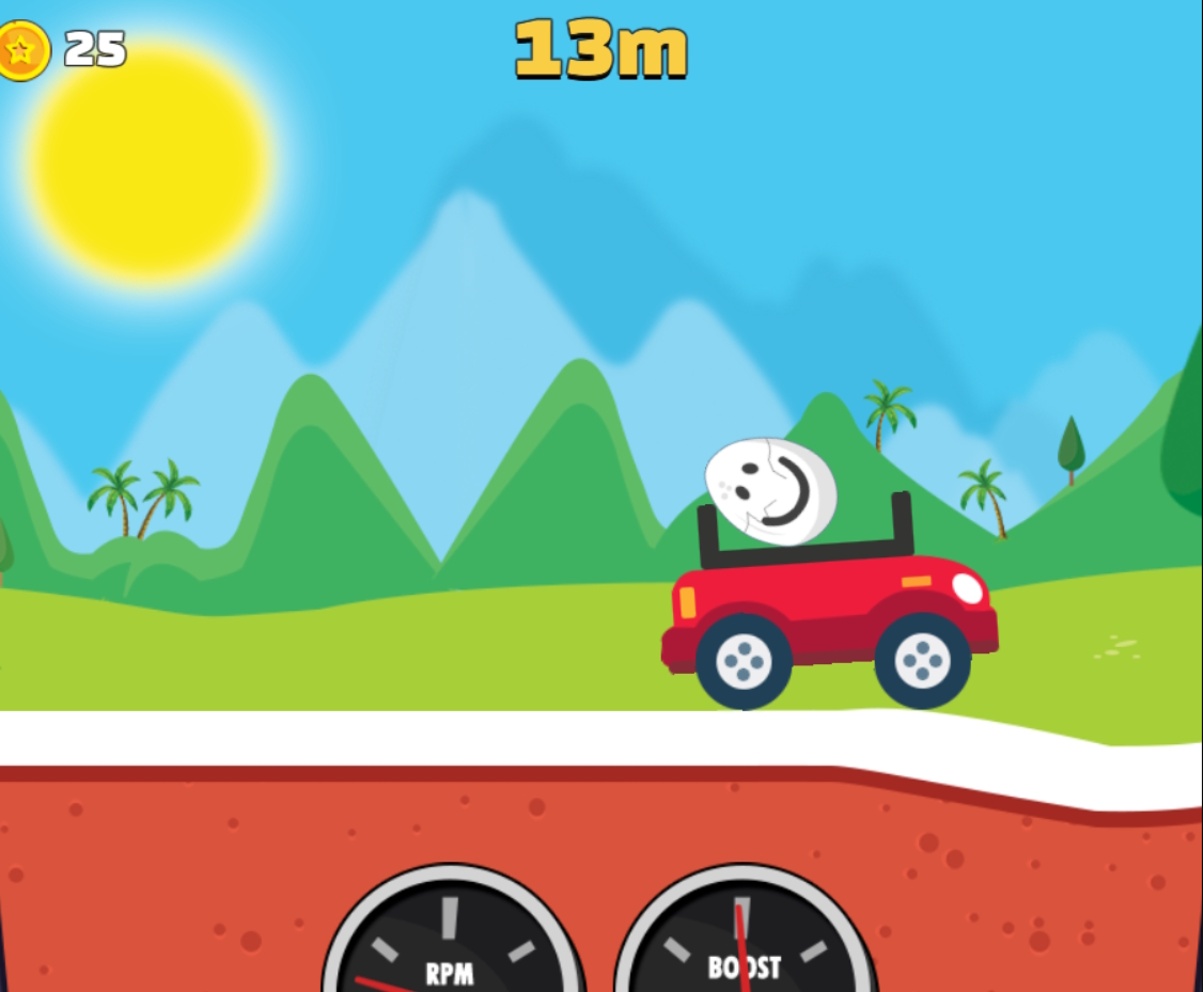 Tahap. Tiada tahap per se dalam permainan. Pemain cuba memandu sejauh mungkin melalui landskap yang dihasilkan secara rawak yang terdiri daripada bukit dan kemerosotan.